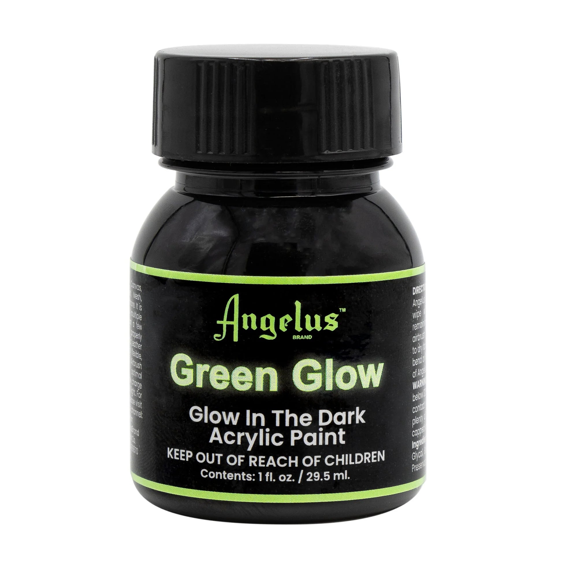 Angelus Green Glow In The Dark hehkuu pimeässä kirkkaammin kuin useimmat markkinoilla olevat maalit. Anna sen vain imeä itseensä valoa (mieluiten auringonvaloa) päivällä ja katso, kun se hehkuu pimeässä!